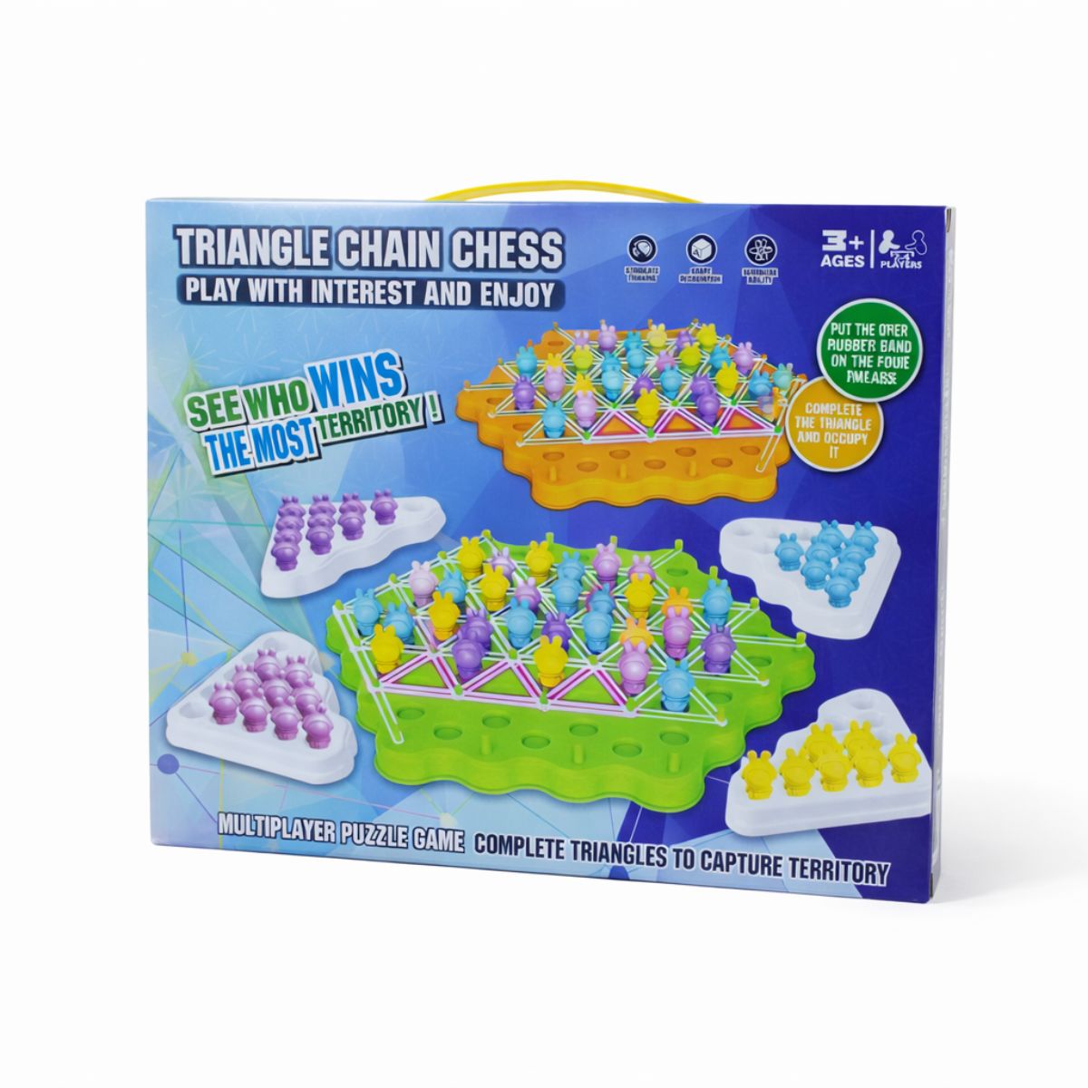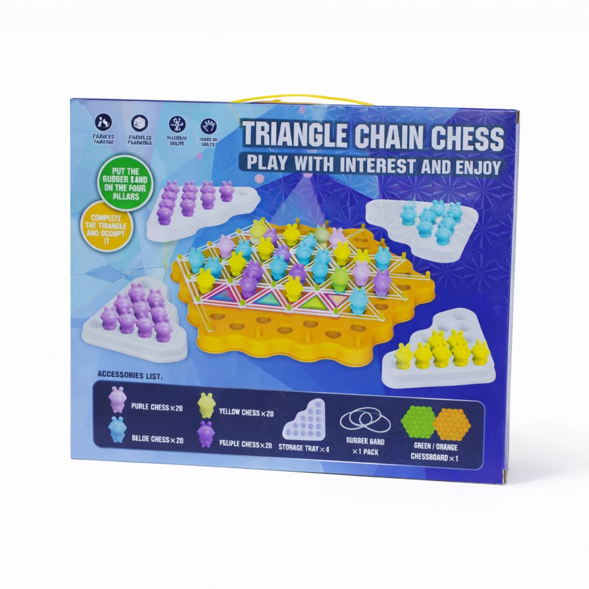 Triangle Chain Chess is an engaging, multiplayer strategy game designed to challenge and entertain young minds. This interactive board game includes a sturdy playing base, colorful rubber bands, and cute character pegs divided into different colors, making it ready for action for up to four players.